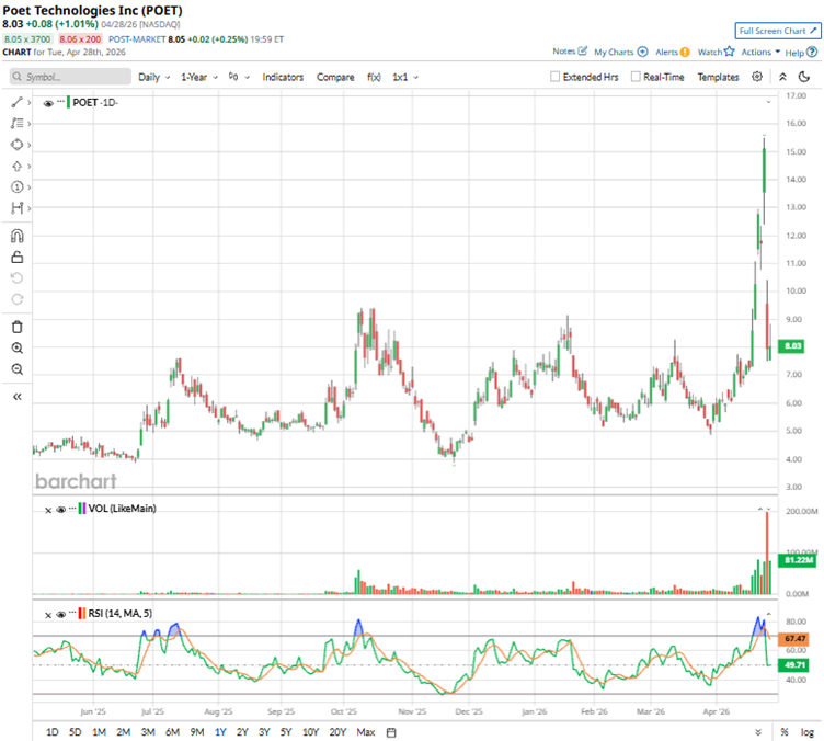 What sets POET apart is its ability to create compact, high-speed multi-chip modules tailored for next-generation applications like AI data centers, telecom networks, and sensing systems. The company, currently finding its footing in the chip space, has a market capitalization of $1.06 billion.