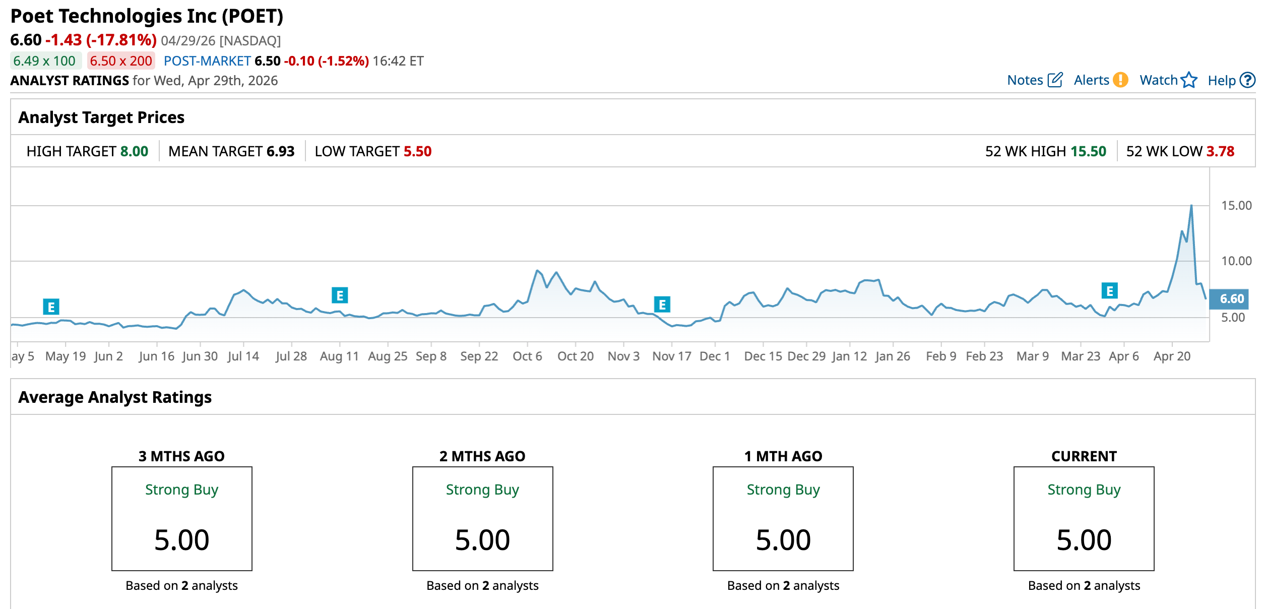POET saw its stock dip 47.4% intraday on April 27 after losing the contract. POET had reached a 52-week high of $15.50 on April 24, but is down 57.4% from that level amid this selloff. Against this backdrop, should you consider buying POET’s stock?