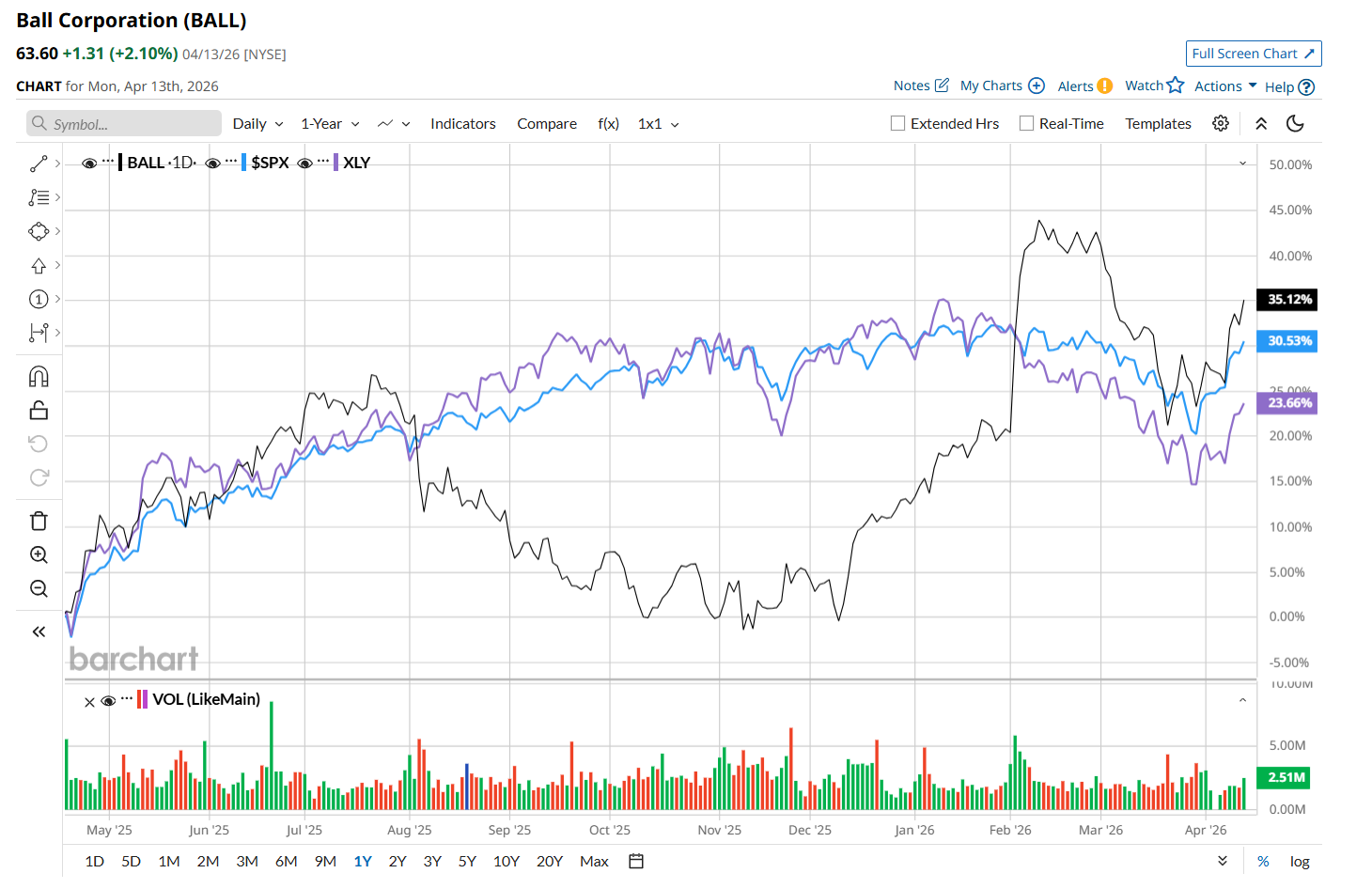 BALL has rallied 32.3% over the past 52 weeks, outpacing both the S&P 500 Index's ($SPX28.4% return and the State Street Consumer Discretionary Select Sector SPDR ETF’s (XLY20.5% uptick over the same time period.
