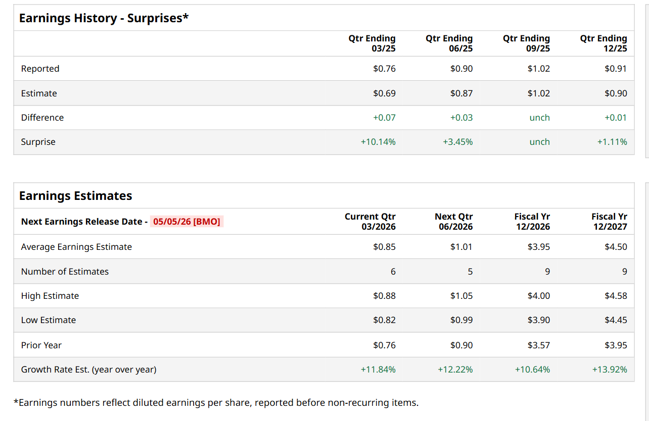 Ahead of this event, analysts expect this packaging company to report a profit of $0.85 per share, up 11.8% from $0.76 per share in the year-ago quarter. The company has met or topped Wall Street’s bottom-line estimates in each of the last four quarters. In Q4 2025, BALL’s EPS of $0.91 outpaced the consensus expectations by a penny.