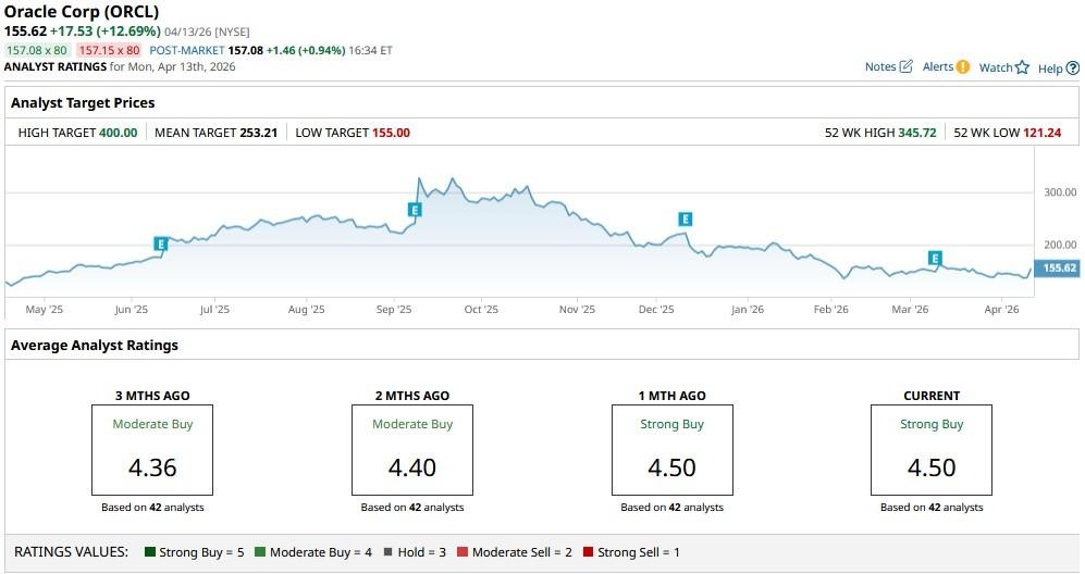 According to Barchart, the consensus rating on Oracle is a “Strong Buy," with the mean price target of about $253 indicating potential upside of a whopping 65% over the next 12 months.