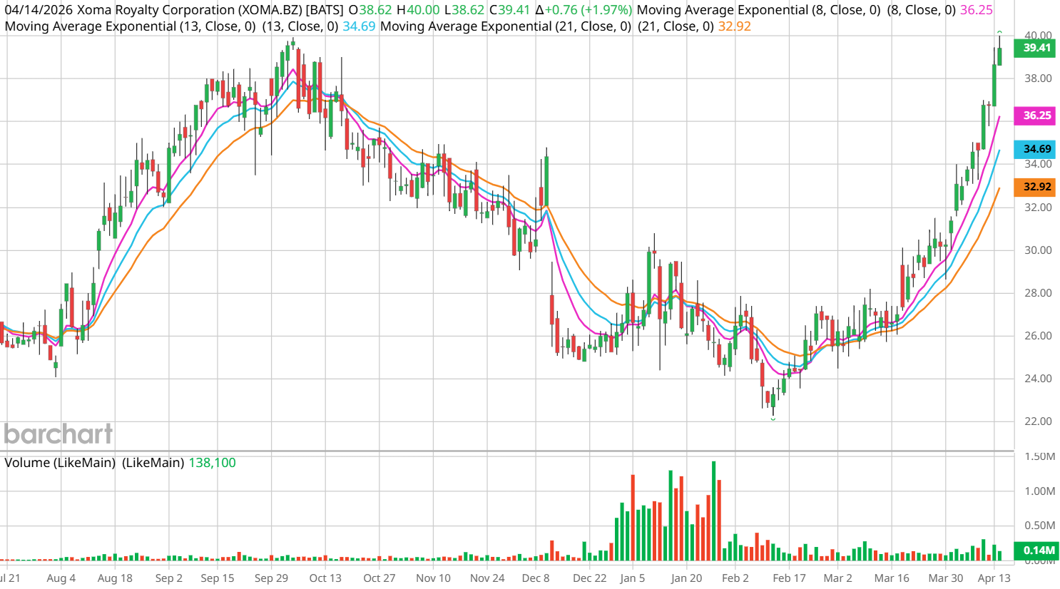 He called out XOMA Royalty (XOMA), which is a company that he warns requires plenty of due diligence. Rowland uncovered this one using Barchart screeners, and told me it might be interesting over the long haul, for traders who can navigate a little short-term FOMO (John would be looking for about a 10% pullback from the current rip higher).