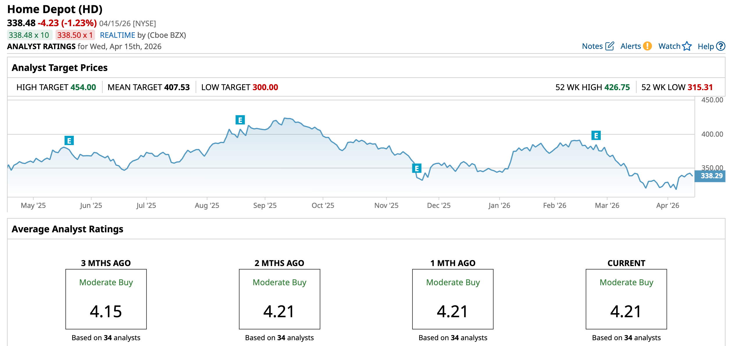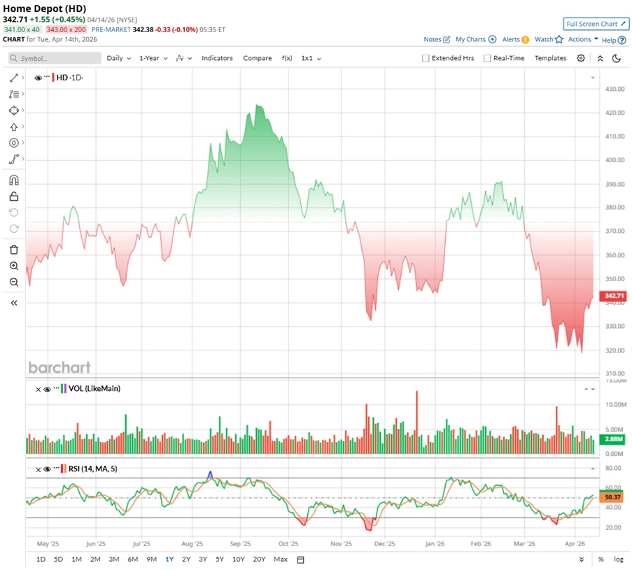 Despite its strength, shares of the home improvement retail giant have seen a mixed run lately, reflecting both pressure and recovery. Over the past 52 weeks, HD stock slipped about 4.52%, and in 2026 so far, the stock is marginally down by 1.74%. The weakness was more visible in the recent quarter, with the stock falling 8.8% over the past three months and touching a low of $315.31 in April.