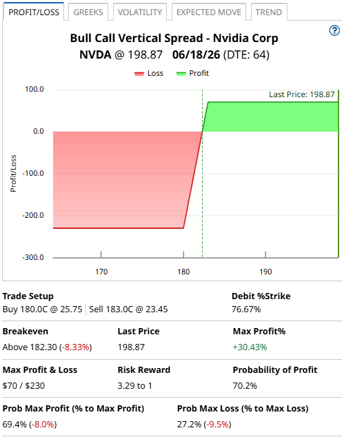 The spread will achieve the maximum profit if NVDA closes above $183 on June 18th. The maximum loss will occur if NVDA closes below $180 on June 18th, which would see the trader lose the $230 premium on the trade.