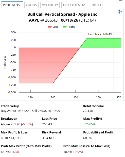 This bull call spread also uses the June expiry and involves buying the $240 strike call and selling the $255 strike call.