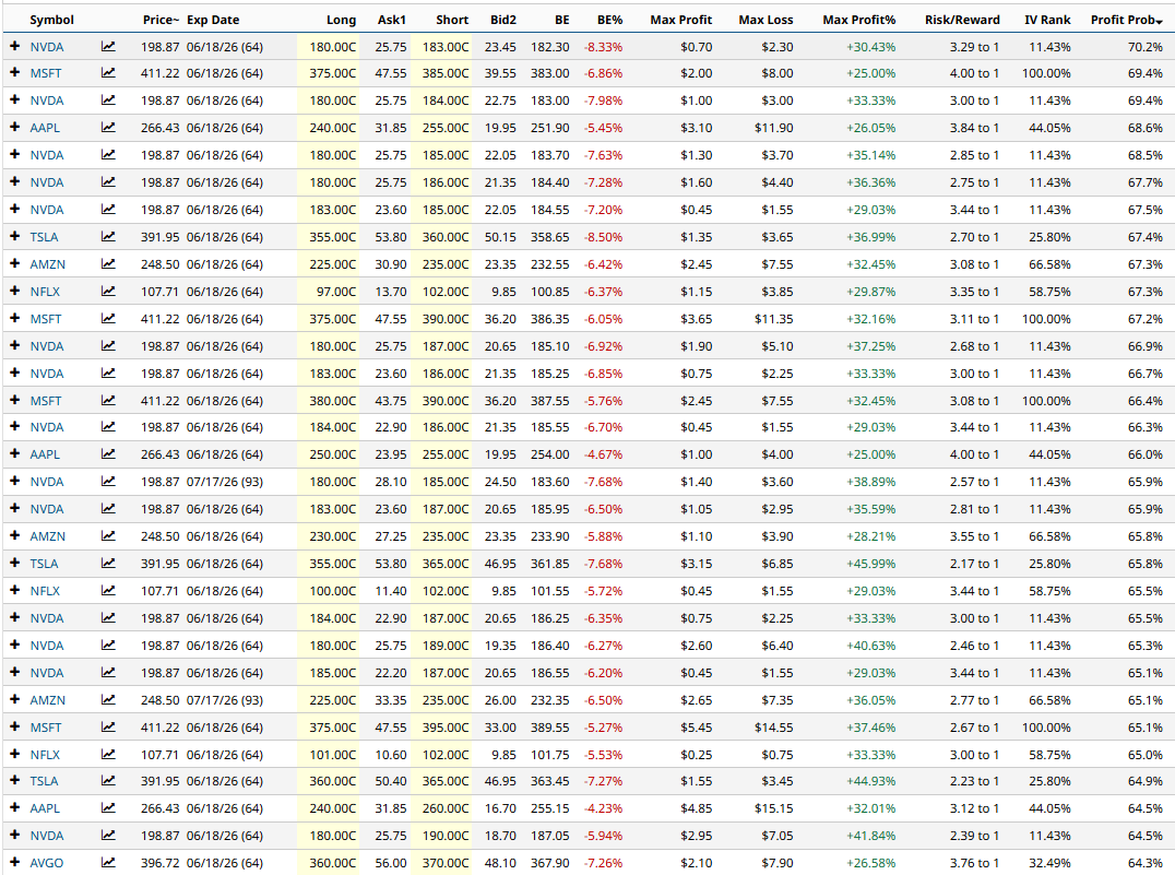 As you can see, the scanner shows some interesting Bull Call Spread trades on stocks such as NVDA MSFT, AAPL, TSLA and NFLX.