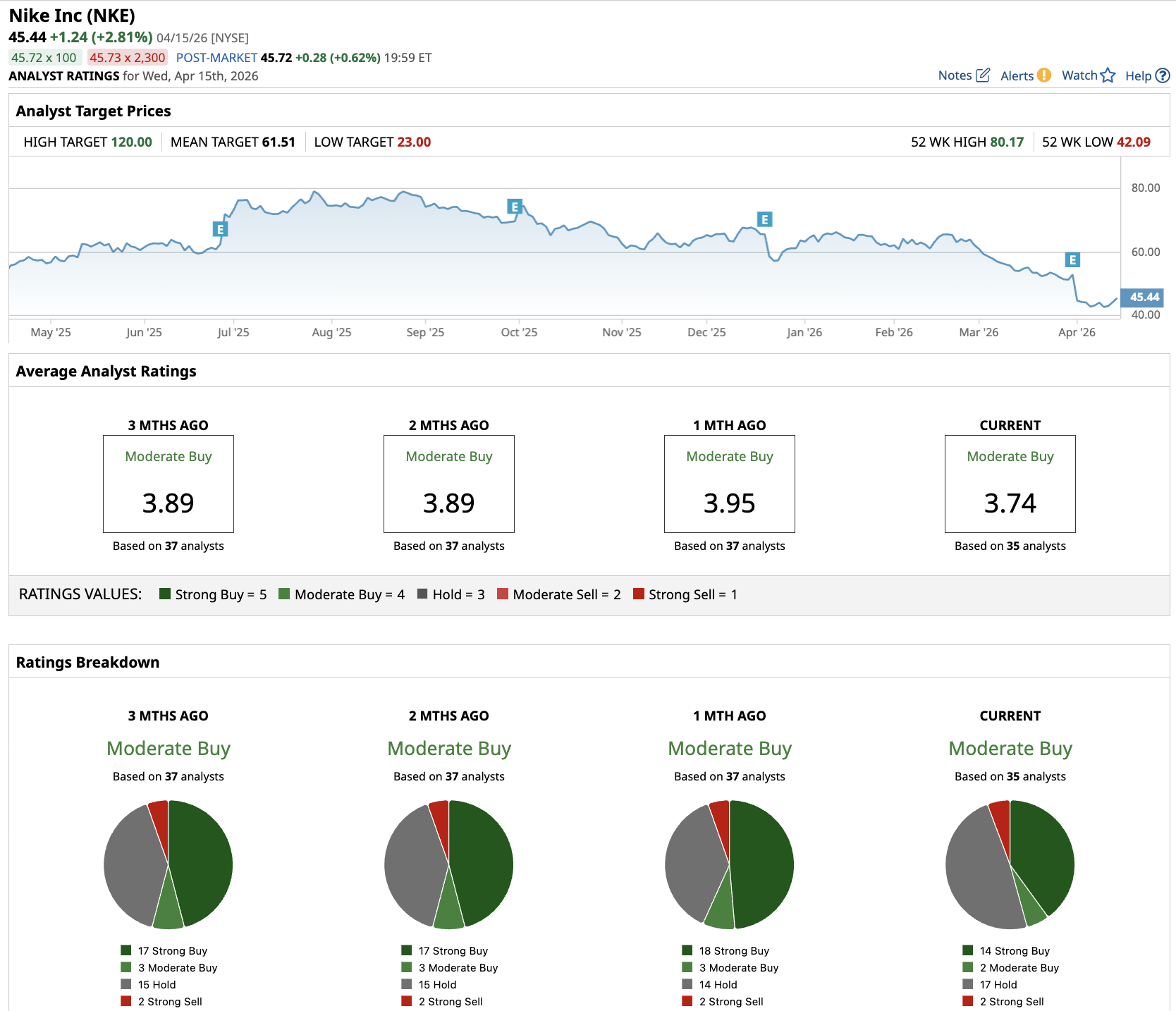 Out of the 35 analysts covering NKE stock, 14 recommend “Strong Buy,” two recommend “Moderate Buy,” 17 recommend “Hold,” and two recommend “Strong Sell.” The average Nike stock price target is $61.51, above the current price of about $45.