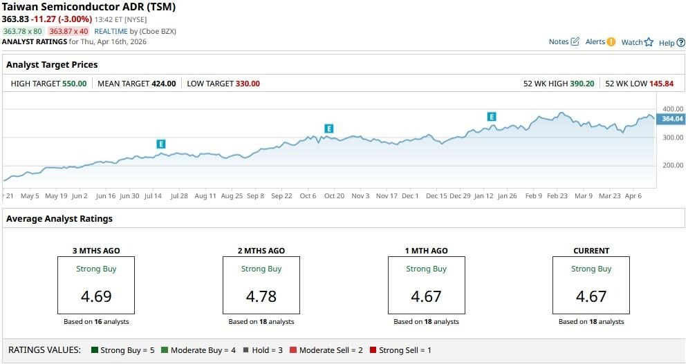 The consensus rating on Taiwan Semiconductor currently sits at a “Strong Buy," with the mean price target of about $424 indicating potential upside of about 17% from here.