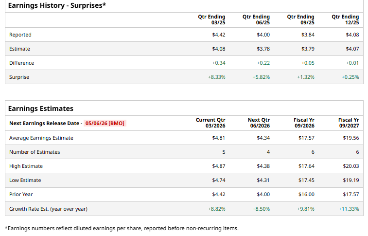 For fiscal 2026, analysts expect the company to report an EPS of $17.57, indicating a 9.8% increase from $16 reported in fiscal 2025. Also, its EPS is expected to grow 11.3% year over year to $19.56 in fiscal 2027.