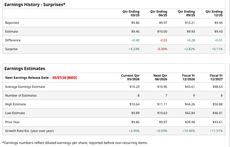 The MRO leader is expected to announce its fiscal 2026 first-quarter earnings before the market opens on Thursday, May 7. Ahead of the event, analysts expect GWW to report a profit of $10.20 per share on a diluted basis, up 3.5% from $9.86 per share in the year-ago quarter. The company surpassed consensus estimates in three of the last four quarters, while missing the forecast in the other quarter.