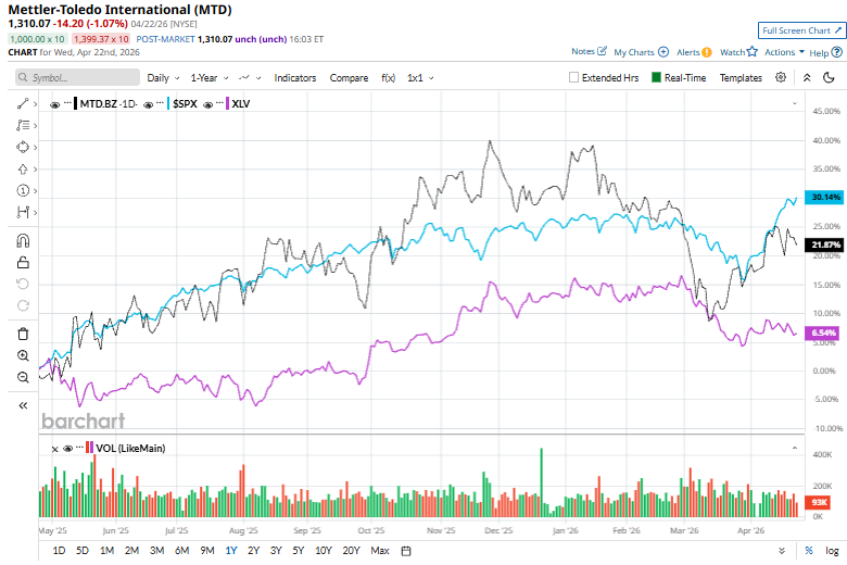 MTD stock has soared 30.6% over the past year, underperforming the S&P 500 Index’s ($SPX) 35% gains but outpacing Health Care Select Sector SPDR Fund’s (XLV) 8.4% returns over the same time frame.