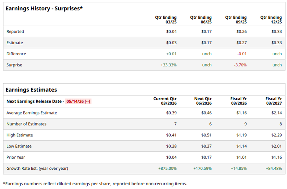 For fiscal 2026, analysts expect the chipmaker to report EPS of $1.16, a rise of 14.9% from $1.01 in fiscal 2025. Moreover, EPS is projected to increase 84.5% year-over-year to $2.14 in fiscal 2027.