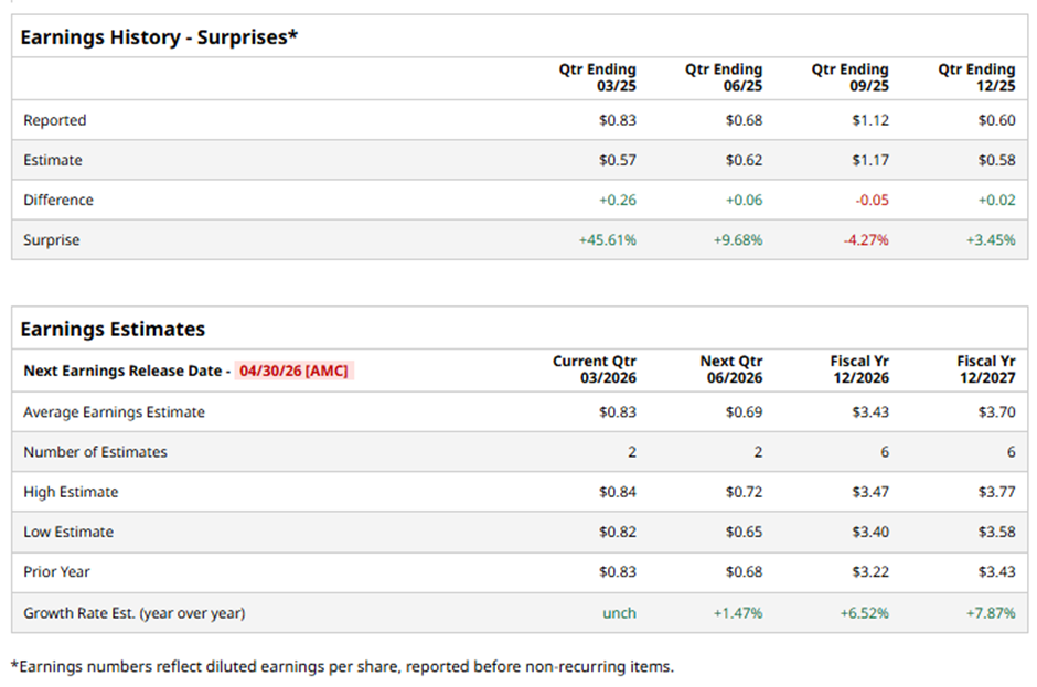 The Madison, Wisconsin-based company is expected to unveil its fiscal Q1 2026 results after the market closes on Thursday, Apr. 30. Before the event, analysts anticipate Alliant Energy to report an adjusted EPS of $0.83, in line with the same quarter last year. It has surpassed Wall Street's bottom-line estimates in three of the past four quarters while missing on another occasion.