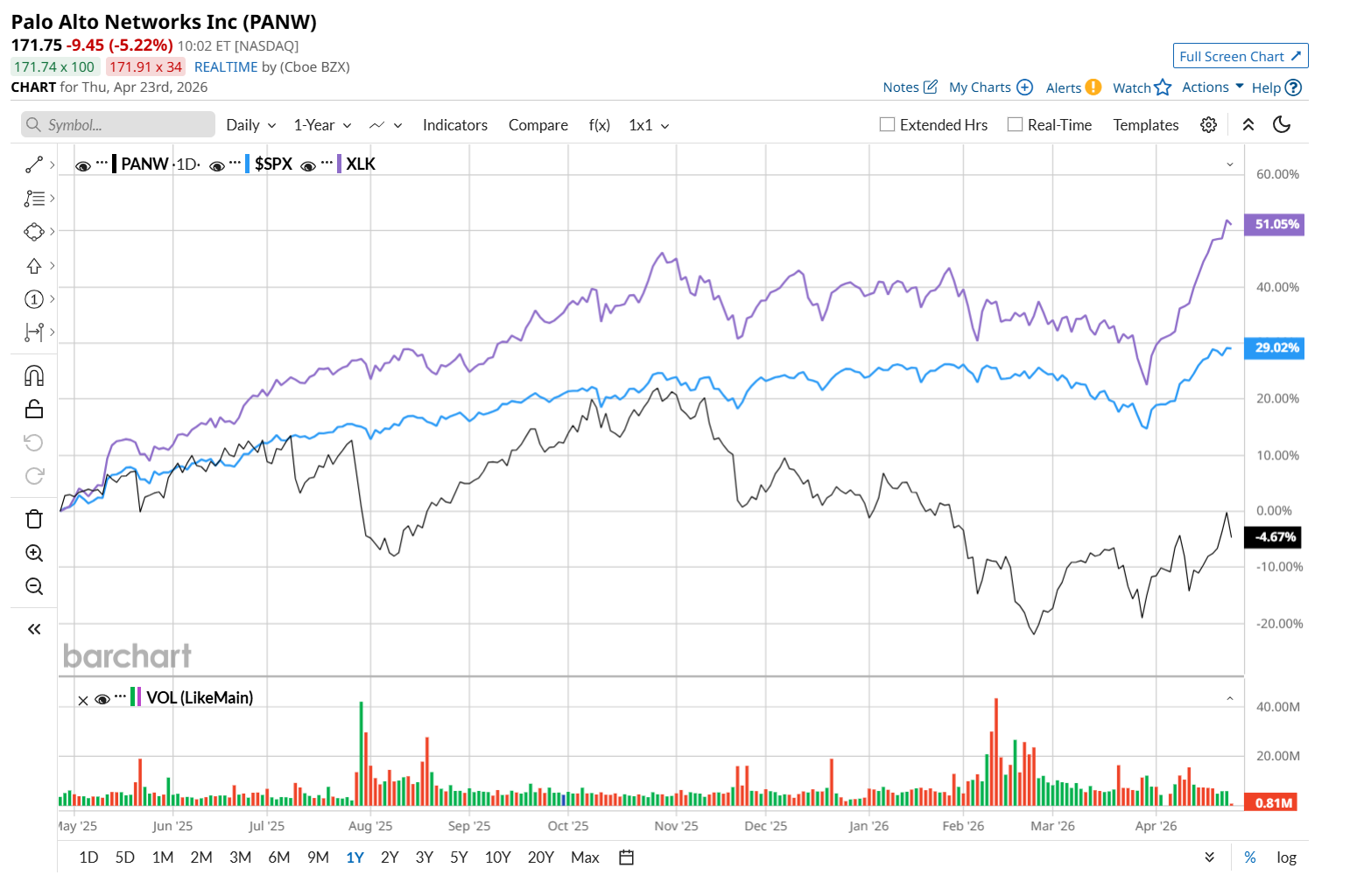 PANW has gained 3% over the past 52 weeks, considerably underperforming both the S&P 500 Index's ($SPX35% return and the State Street Technology Select Sector SPDR ETF’s (XLK64.3% uptick over the same time period.