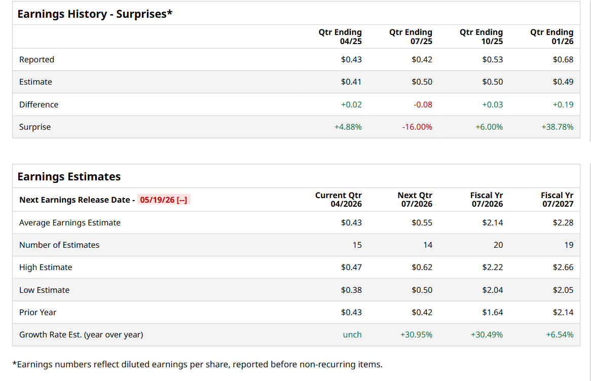 Santa Clara, California-based Palo Alto Networks, Inc. (PANW) is a cybersecurity company that provides advanced, AI-powered security solutions for enterprises, service providers, and government entities. Valued at a market cap of $147.9 billion, the company is scheduled to announce its fiscal Q3 earnings for 2026 in the near future.