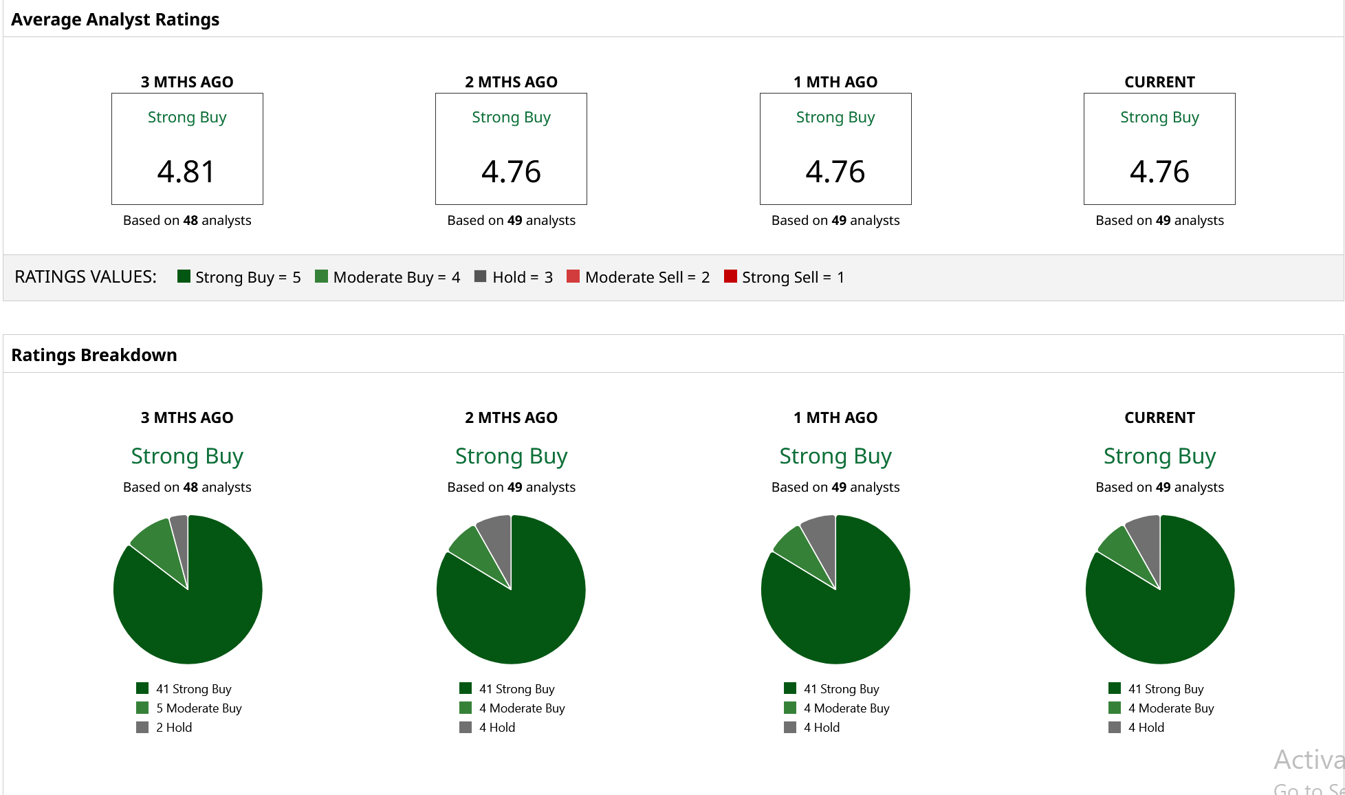 MSFT stock enjoys a consensus “Strong Buy” rating from 49 Wall Street analysts covering the stock. The mean price target of $579.01 implies 36% potential upside from current levels.