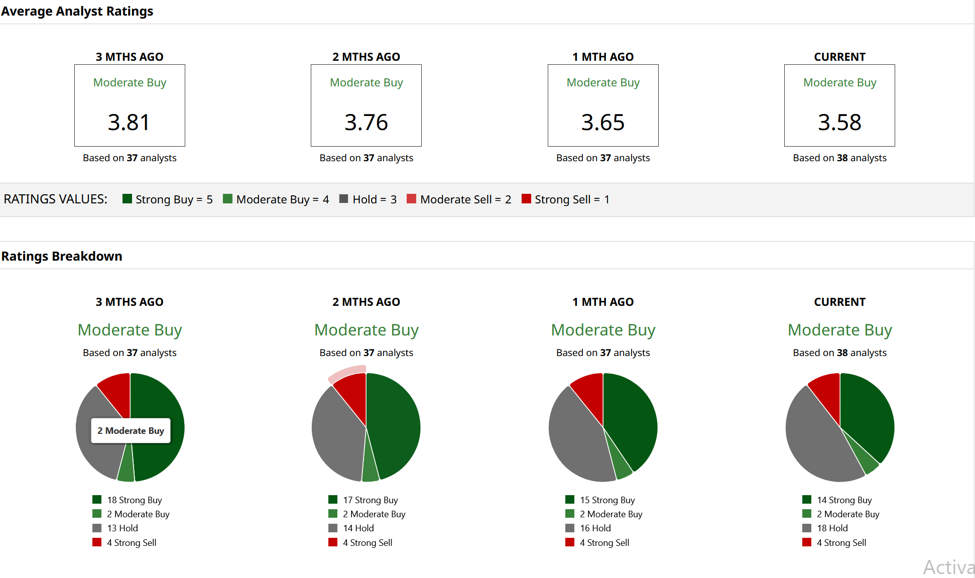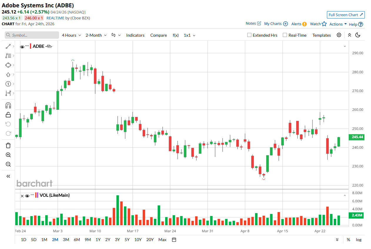 ADBE stock carries a consensus “Moderate Buy” rating based on 38 Wall Street analysts with coverage. Adobe has a mean price target of $323.83, reflecting 35% potential upside from the current levels.