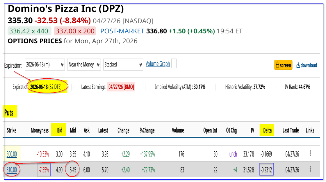 However, for new DPZ investors, look at the June 18 expiry period, 52 days from now. It shows that the $310 put strike price has a midpoint premium of $5.45.
