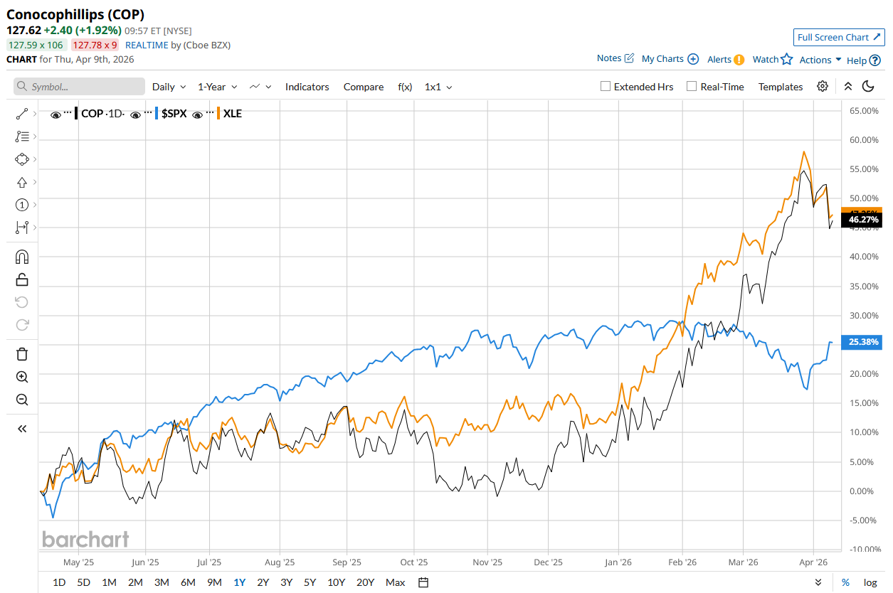 COP stock has surged 37.9% over the past 52 weeks, outperforming the S&P 500 Index’s ($SPX24.2% rise, but lagging behind the State Street Energy Select Sector SPDR ETF’s (XLE42.1% return during the same time frame.