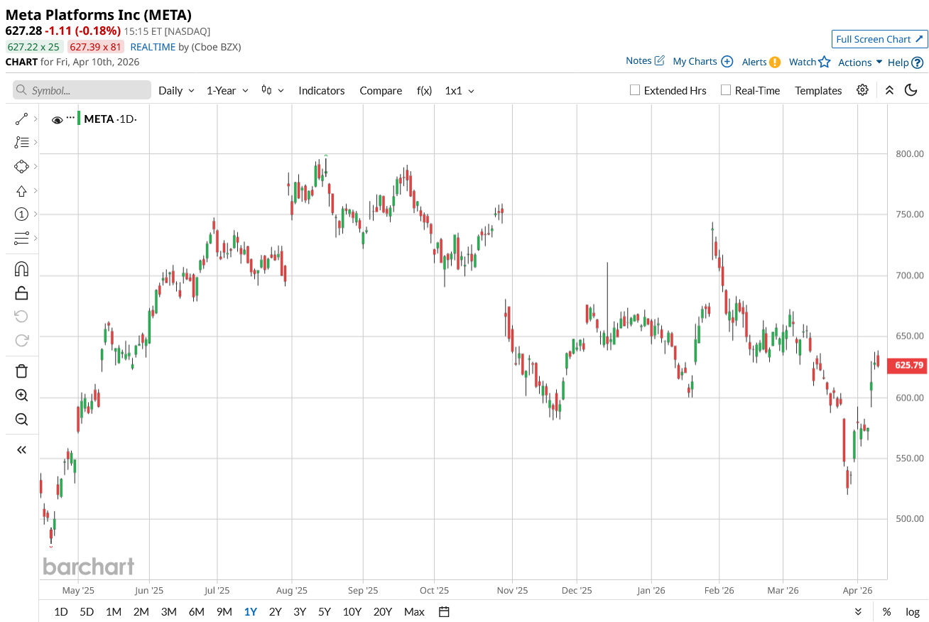 META’s share price is $627.28 as of April 10, with a year-to-date (YTD) return of -5.3% and a 52‑week gain of 14%.