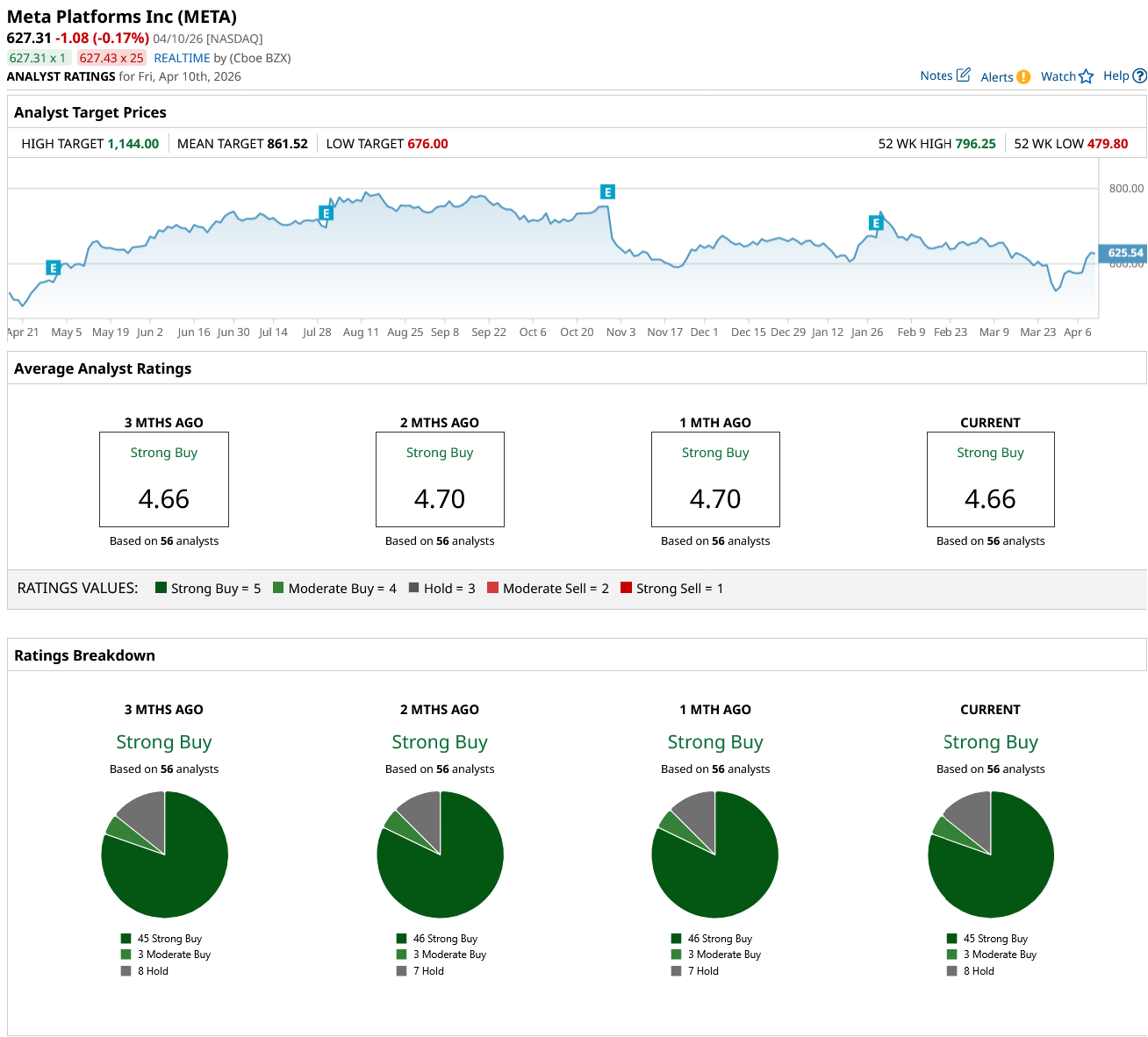 Support like that lines up with what Wall Street is signaling. The consensus view from 56 analysts is a “Strong Buy” rating on META stock, with an average price target of $861.52, which points to about 37% upside from current levels.