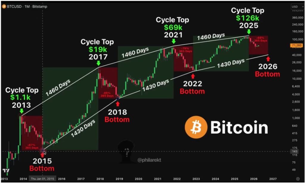 A crypto market analyst known as Philarekt on X has predicted the precise timeline and target for Bitcoin’s final cycle bottom. To support his predictions, the expert presented a chart comparing Bitcoin’s past market cycles from 2013 to 2026, showing when each bull run began, when the bear market ended, and how long each phase lasted.
