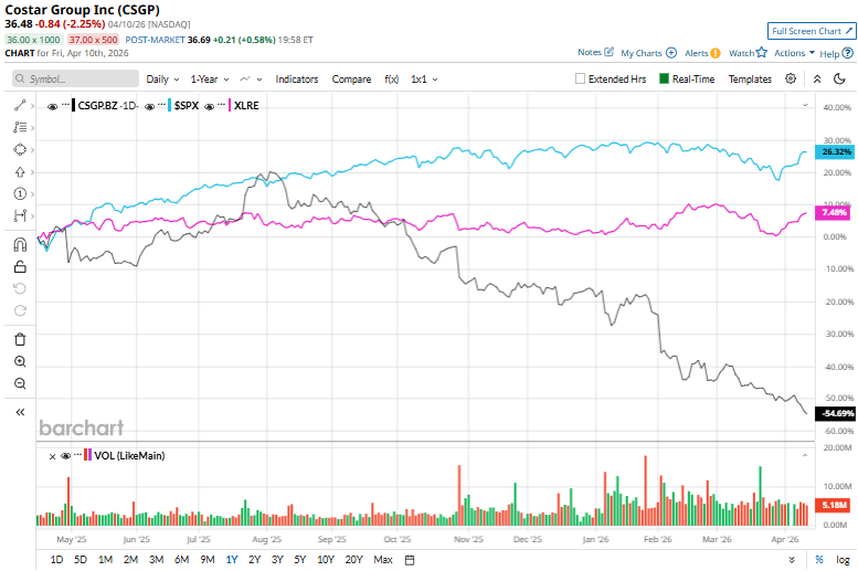 CSGP stock has dwindled 51.6% over the past year, underperforming the S&P 500 Index’s ($SPX29.4% gains and the State Street Real Estate Select Sector SPDR Fund’s (XLRE11.6% gains over the same time frame.