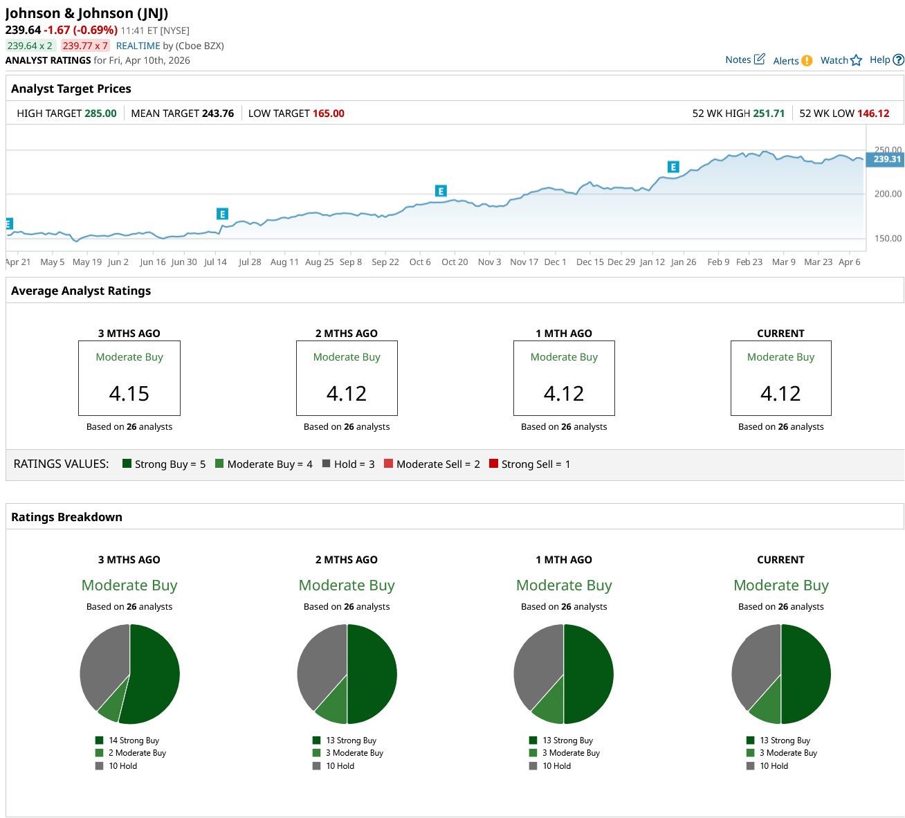 On Wall Street, JNJ stock is a “Moderate Buy.” Out of the 26 analysts covering the stock, 13 rate it a “Strong Buy,” three rate it a “Moderate Buy,” and 10 rate it a “Hold.” JNJ stock is trading close to its mean target price of $243.76. Meanwhile, its high target price of $285 implies a potential upside of 19% in the next 12 months.