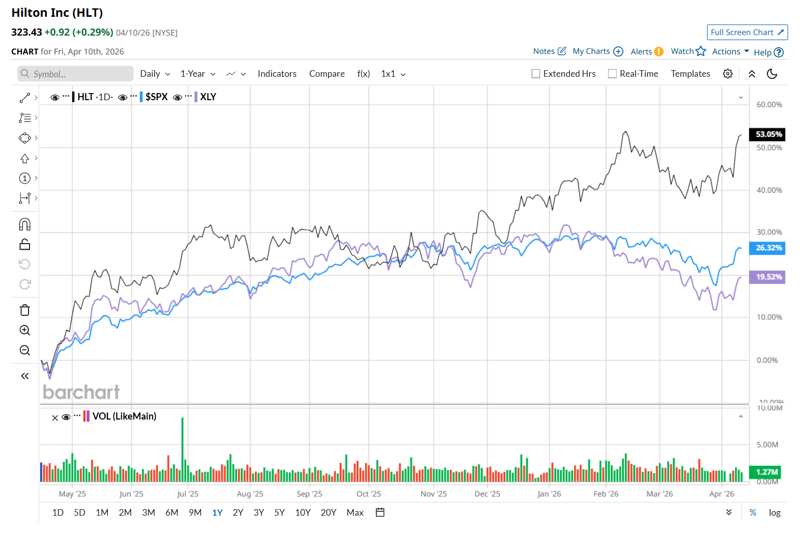 HLT has rallied 54.1% over the past 52 weeks, considerably outperforming both the S&P 500 Index's ($SPX29.4% return and the State Street Consumer Discretionary Select Sector SPDR ETF’s (XLY20.2% uptick over the same time period.
