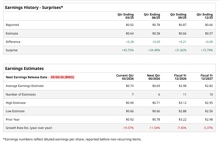The pharmaceutical giant is expected to announce its fiscal first-quarter earnings for 2026 before the market opens on Sunday, May 5. Ahead of the event, analysts expect PFE to report a profit of $0.74 per share on a diluted basis, down 19.6% from $0.92 per share in the year-ago quarter. The company has consistently surpassed Wall Street’s EPS estimates in its last four quarterly reports.