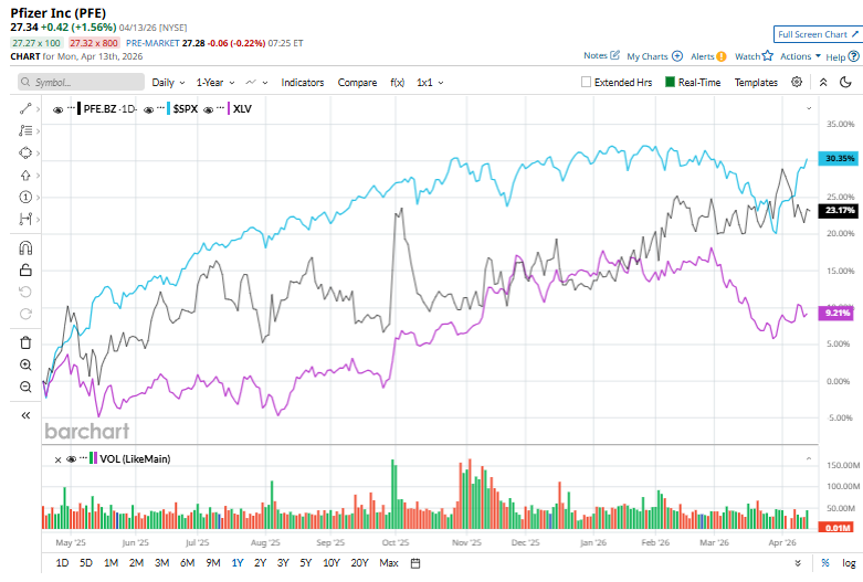PFE stock has surged 24.8% over the past year, underperforming the S&P 500 Index’s ($SPX28.4% gains. However, it surpassed the State Street Health Care Select Sector SPDR Fund’s (XLV8.1% returns over the same time frame.