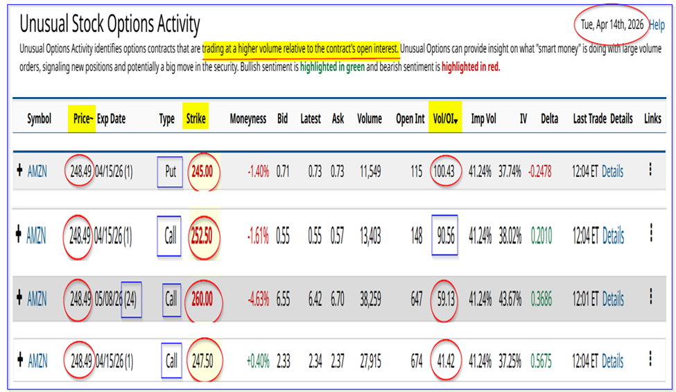 A Barchart report today shows huge, unusual volume in Amazon Inc. (AMZN) options ahead of its earnings due out at the end of the month. Investors are piling into AMZN stock ahead of earnings, as well as from a recent CNBC report that OpenAI is partnering with Amazon.