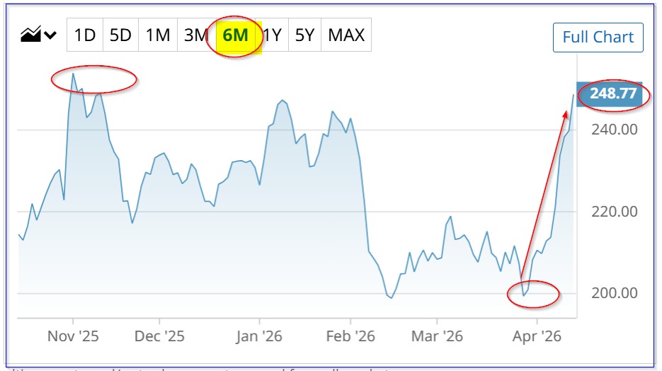 AMZN is up over 4% today at $249.55, up from a recent low below $200 on March 27 ($199.34). However, it's still below a 6-month peak of $254.00 on Nov. 3, 2025.