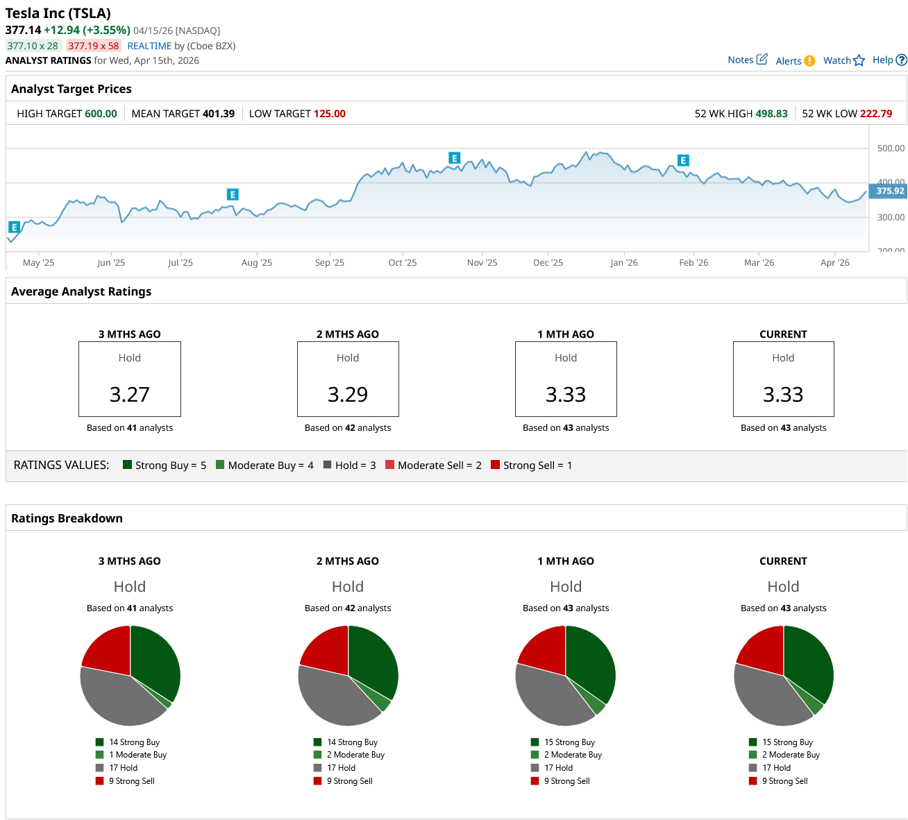 Out of the 43 analysts covering TSLA stock, 15 recommend “Strong Buy,” two recommend “Moderate Buy,” 17 recommend “Hold,” and nine recommend “Strong Sell.” The average Tesla stock price target is $401.39, above the current price of about $377.