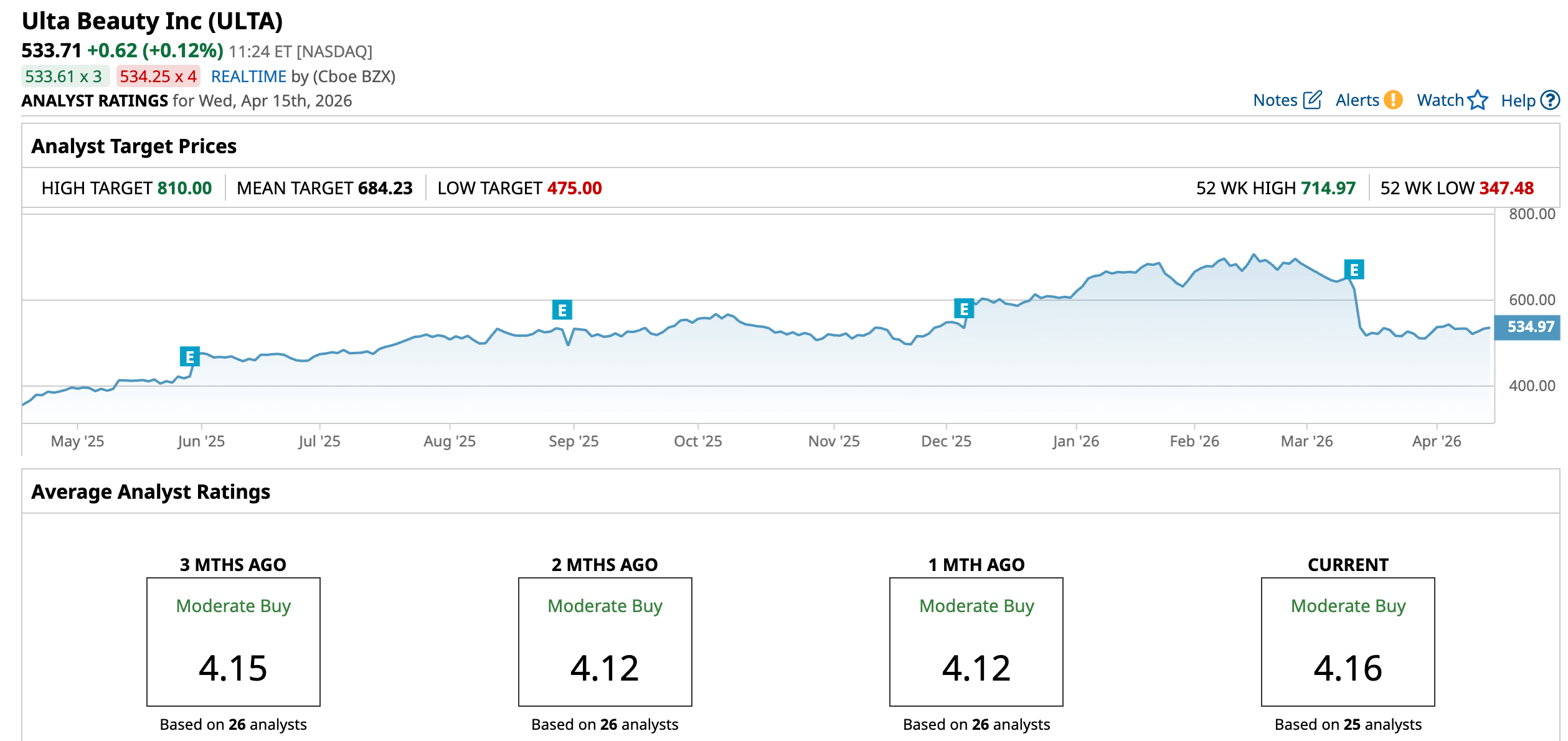 Wall Street has placed ULTA stock firmly in “Moderate Buy” territory. Out of 25 analysts covering the stock, 15 have issued “Strong Buy” ratings, one has gone with “Moderate Buy,” eight have stayed on “Hold,” and one has waved a “Strong Sell” flag.