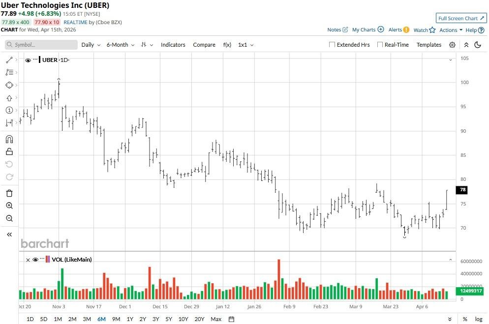 Uber Technologies (UBER) is inching higher on April 15 after announcing a landmark $10 billion commitment to its robotaxi strategy, headlined by an expanded deal with Lucid Group (LCID).