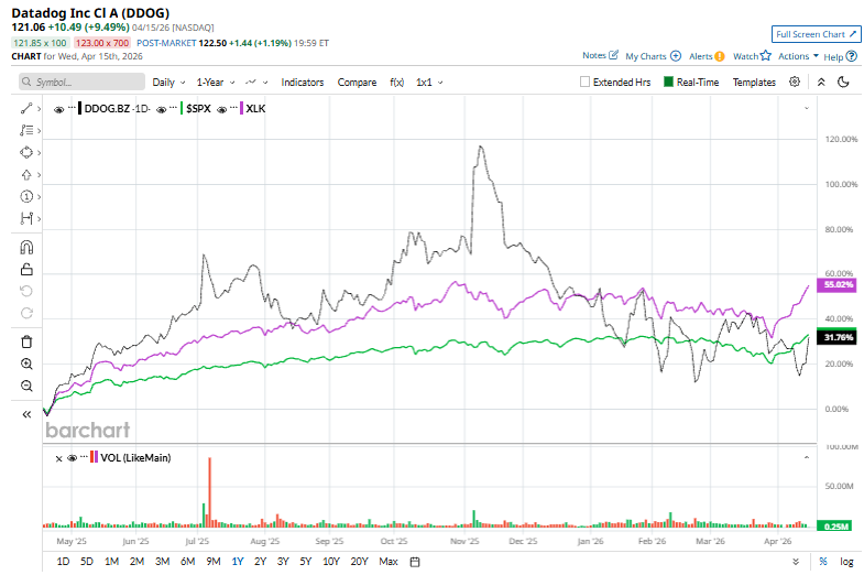 On Apr. 15, Datadog shares surged 8.4% as a broader tech rally pushed the Nasdaq toward record highs, fueled by improving market sentiment amid hopes of easing U.S.-Iran tensions and strong momentum in AI-related developments.