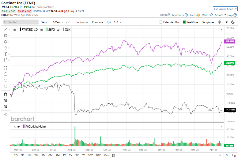 FTNT has declined 19.7% over the past 52 weeks, underperforming the S&P 500 Index’s ($SPX30.1% gains and the Technology Select Sector SPDR Fund’s (XLK49.6% rise over the same time frame.