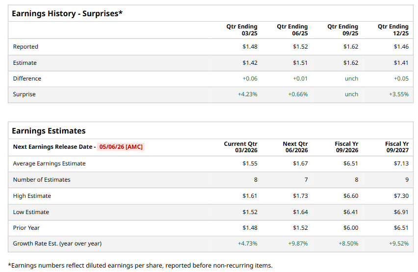 For the full year, analysts expect EMR to report EPS of $6.51, up 8.5% from $6 in fiscal 2025. Its EPS is expected to rise 9.5% year over year to $7.13 in fiscal 2027.