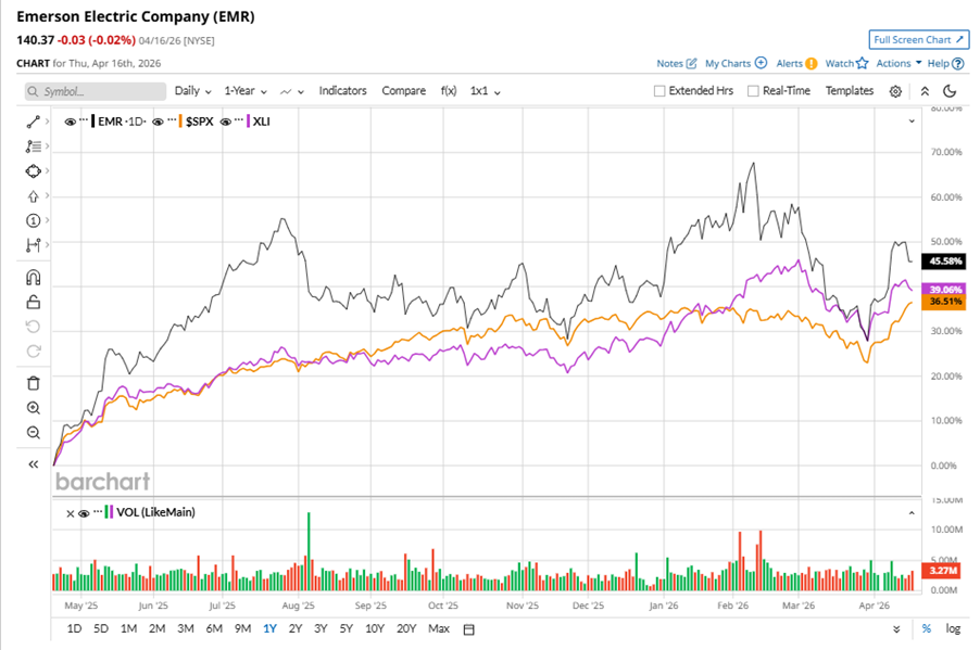 EMR stock has outperformed the S&P 500 Index’s ($SPX) 33.5% gains over the past 52 weeks, with shares up 42.3% during this period. Similarly, it outperformed the State Street Industrial Select Sector SPDR ETF’s (XLI) 36.7% gains over the same time frame.