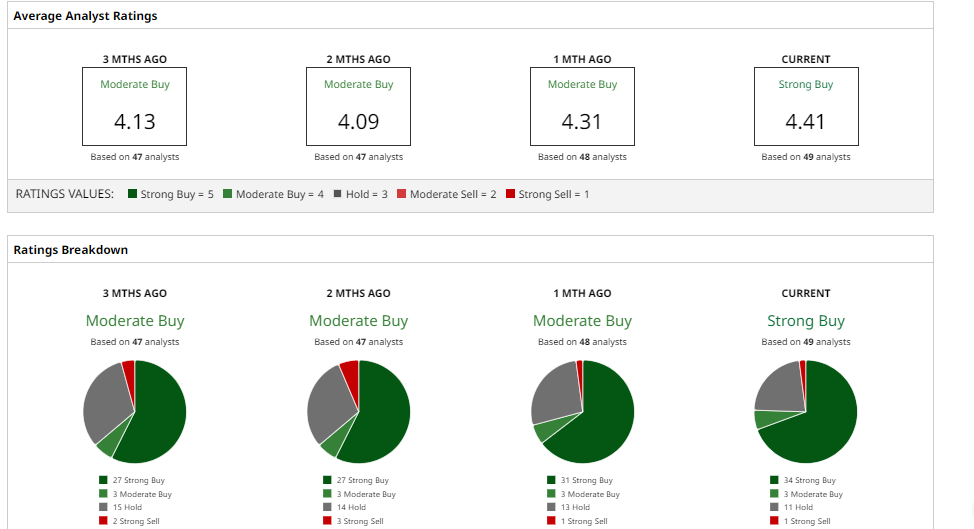 Overall, Barchart shows a “Moderate Buy” consensus with 49 analysts and shows an average target near $492 with about 11% upside from the latest price.