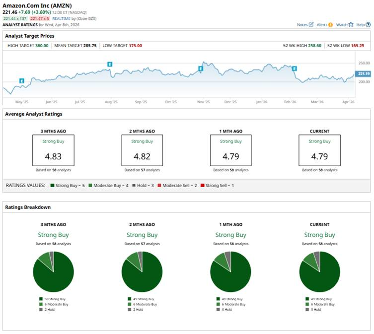 Overall, AMZN stock has a consensus “Strong Buy” rating. Of the 58 analysts covering the stock, 49 advise a “Strong Buy,” six suggest a “Moderate Buy,” and three analysts recommend a “Hold” rating.