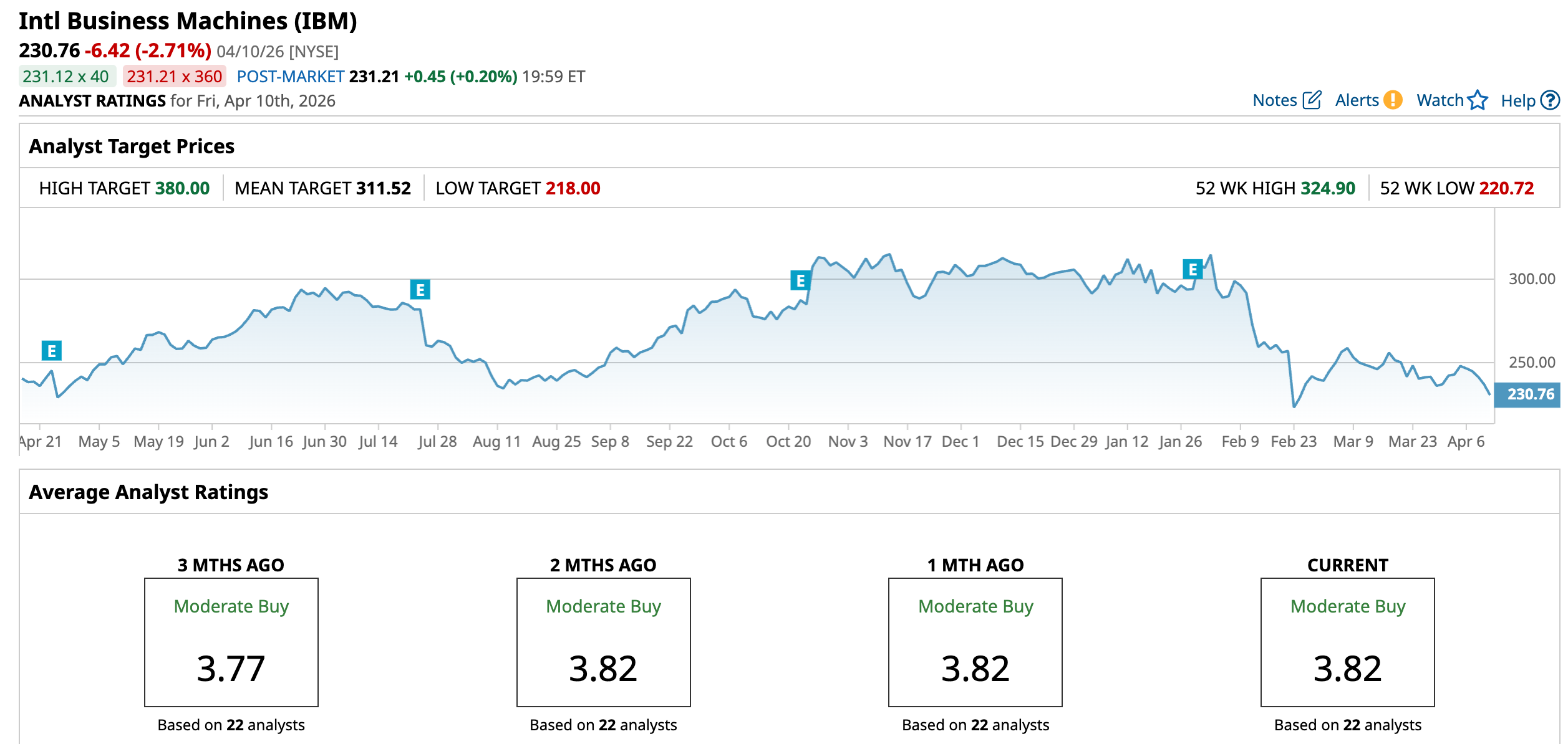 Despite these revisions, IBM stock continues to hold an overall “Moderate Buy” rating. Among 22 analysts covering the stock, nine rate it “Strong Buy,” two assign “Moderate Buy,” 10 recommend “Hold,” and one maintains a “Strong Sell.”