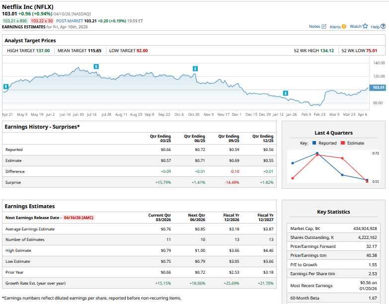 Analysts expect Netflix to report revenue of $12.17 billion in the March quarter, a year-over-year (YOY) increase of more than 15%. These estimates are in line with guidance that the company provided earlier this year while releasing Q4 2025 earnings. Analysts are also modelling for EPS of 76 cents, which is similar to the company’s guidance.