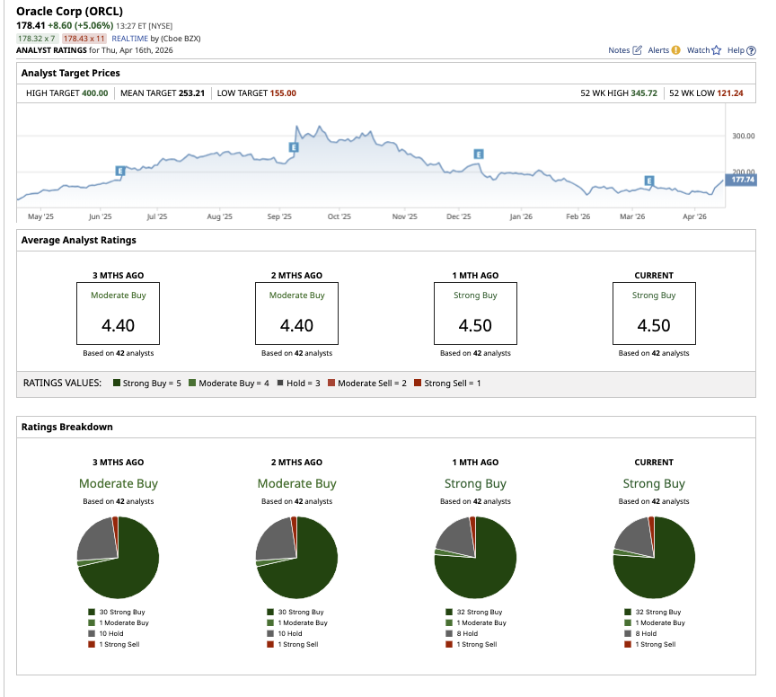 Overall, Wall Street has a consensus “Strong Buy” rating for Oracle stock. Out of the 42 analysts covering ORCL stock, 32 analysts have a “Strong Buy,” one has a “Moderate Buy,” eight have a “Hold” rating, and one analyst has a “Strong Sell" rating. The average target price is $253.21, representing potential upside of 44% from current levels. ORCL stock also has a high price estimate of $400, which suggests potential upside of 128% over the next 12 months.