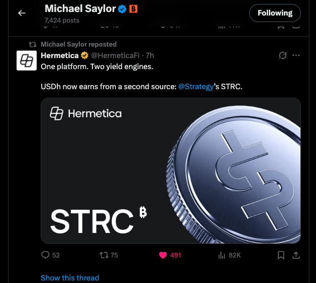Hermetica today launched hBTC, a self-custodial Bitcoin yield vault built on Stacks, earning yield from Strategy's $STRC, Stacks’ Dual Staking, and other Bitcoin-native yield sources. The launch comes after Michael Saylor reposted Hermetica's yield announcement for USDh, underscoring the growing institutional appetite for productive Bitcoin capital. With 25 BTC already committed in its initial cohort — currently earning BTC-denominated yield on a daily basis through Strategy-linked exposure and Stacks Dual Staking — hBTC is now opening allocation to a broader set of institutional participants.