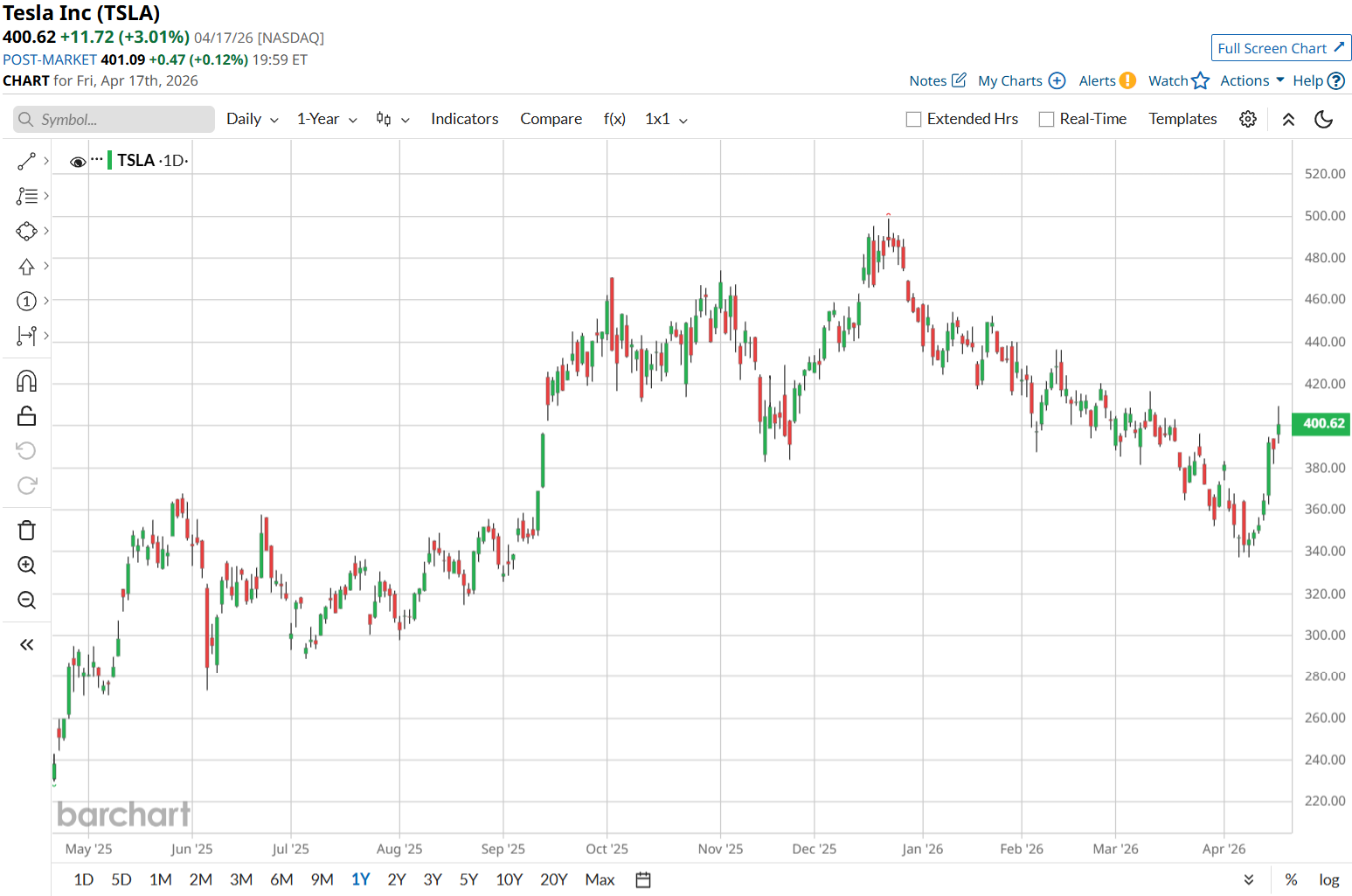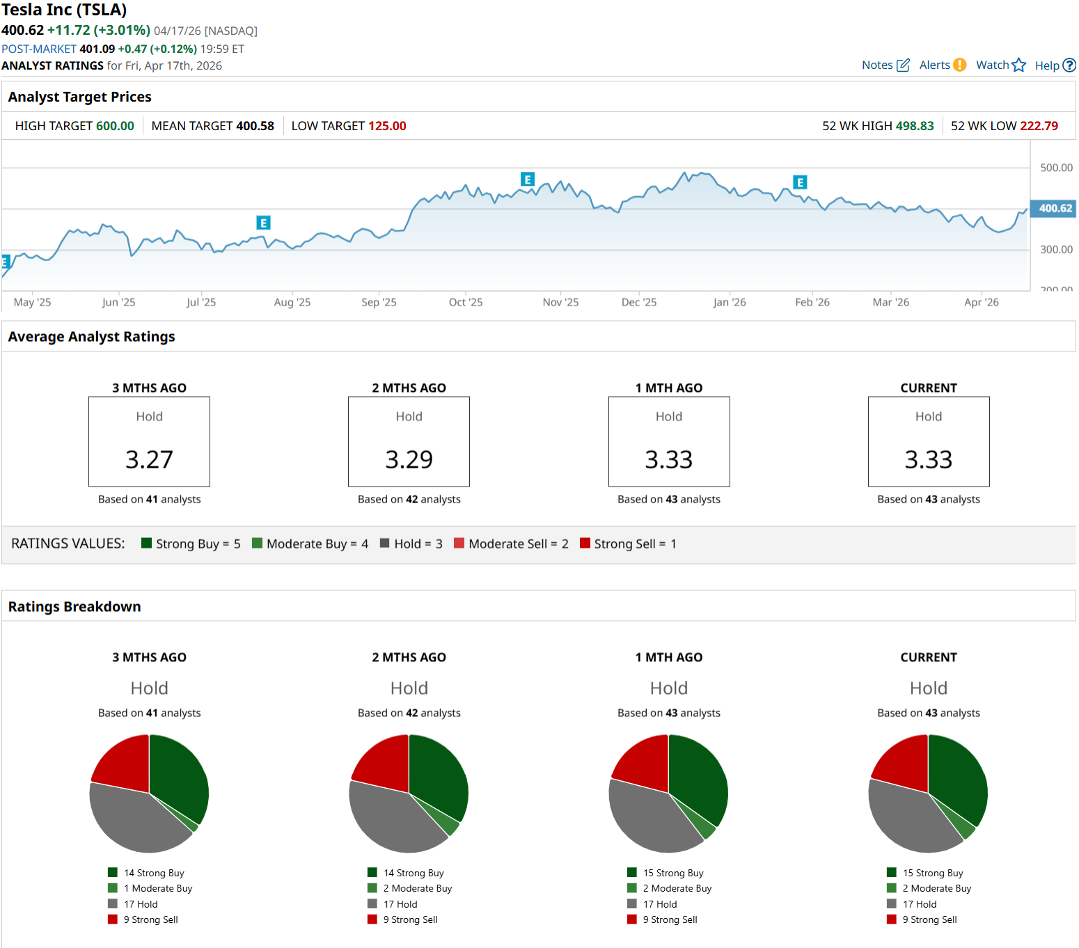 Overall, TSLA stock has a consensus “Hold” rating from 43 analysts, with an average price target of $400.58. Because the stock recently surpassed the $400 level before retreating to around $386 as of this writing, it is basically sitting right at that target. That suggests Wall Street sees limited upside from here.