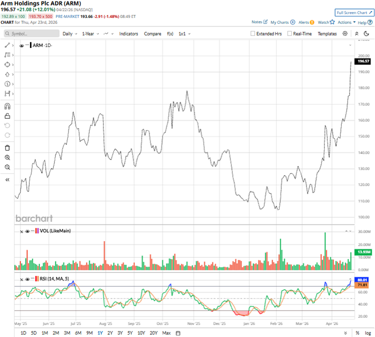 Driven by robust demand for its architecture in AI-powered chips, data centers, and Internet of Things devices, Arm’s stock has gained 93.72% over the past 52 weeks and 86.37% year-to-date (YTD).