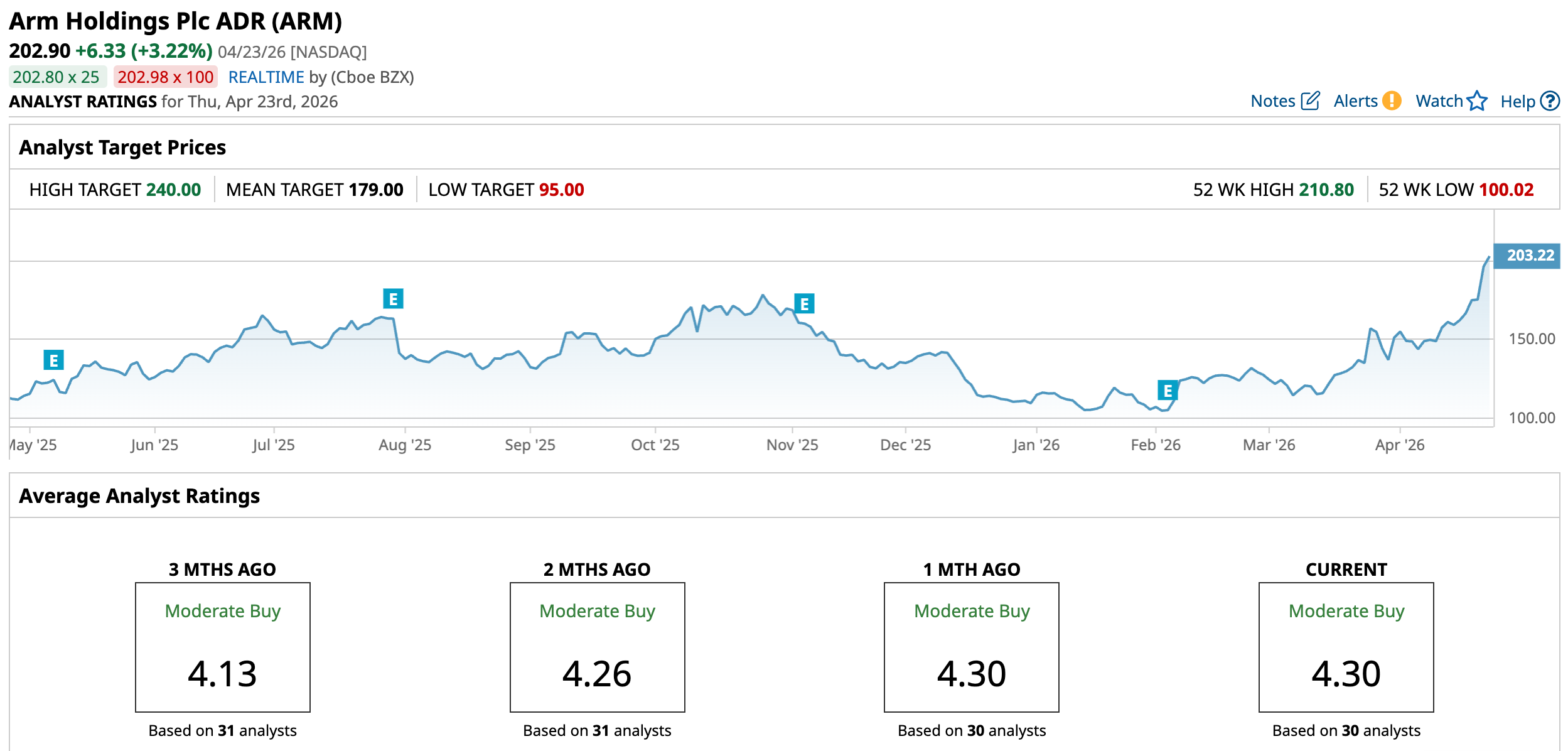 Arm Holdings is still praised on Wall Street, with analysts awarding the stock an overall “Moderate Buy” rating. Of the 30 analysts rating the stock, 19 have rated it a “Strong Buy,” three a “Moderate Buy,” seven a “Hold,” and one a “Strong Sell.” The consensus price target of $179 represents an 11.8% downside from current levels. However, the Street-high price target of $240 indicates an 18.3% upside.
