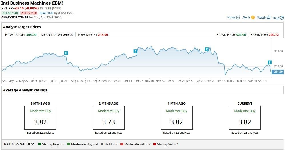 The consensus rating on IBM stock remains at a “Moderate Buy” with the mean price target of about $299, indicating potential upside of roughly 30% from here.